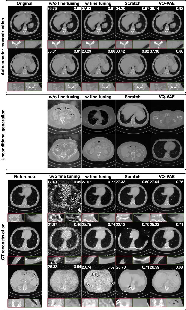Comparison of autoencoder reconstruction, unconditional diffusion generation, and CT reconstruction across different autoencoders. The VQ-VAE used in our benchmark produces consistently superior representations and reconstructions, while SDXL AutoencoderKL variants exhibit reduced stability and quality.