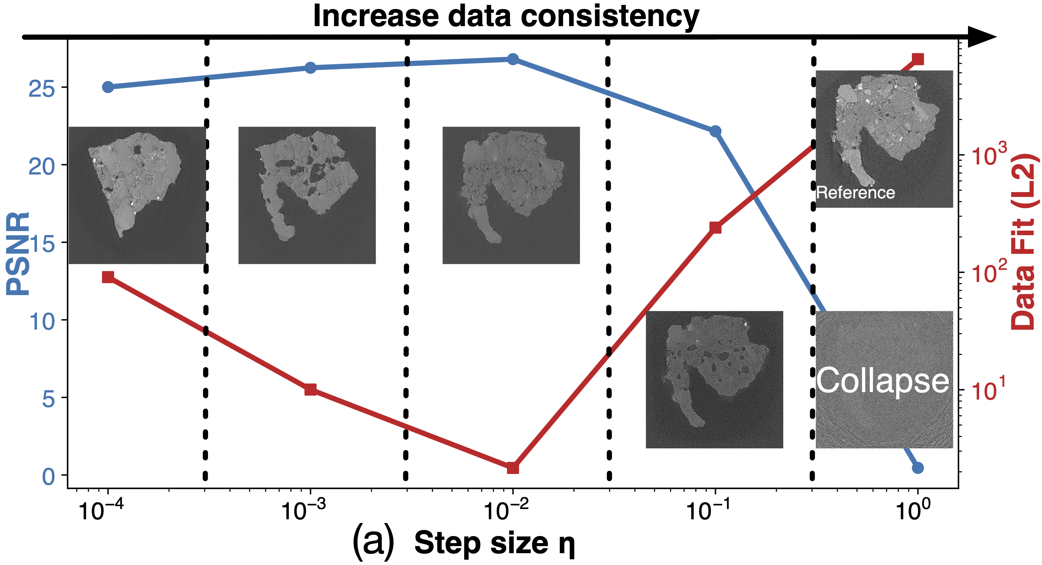 (a) Impact of data consistency step size η on PSNR and data fit in DPS. Moderate values improve both, while large η disrupts denoising and causes collapse. Visual examples in the plot highlight the transition from prior-dominated to noise-dominated reconstructions. (b) Mean and standard deviation of ten MCG reconstructions conditioned on the same real measurement. Note that the real measurement used in (b) is different from the one used for (a).