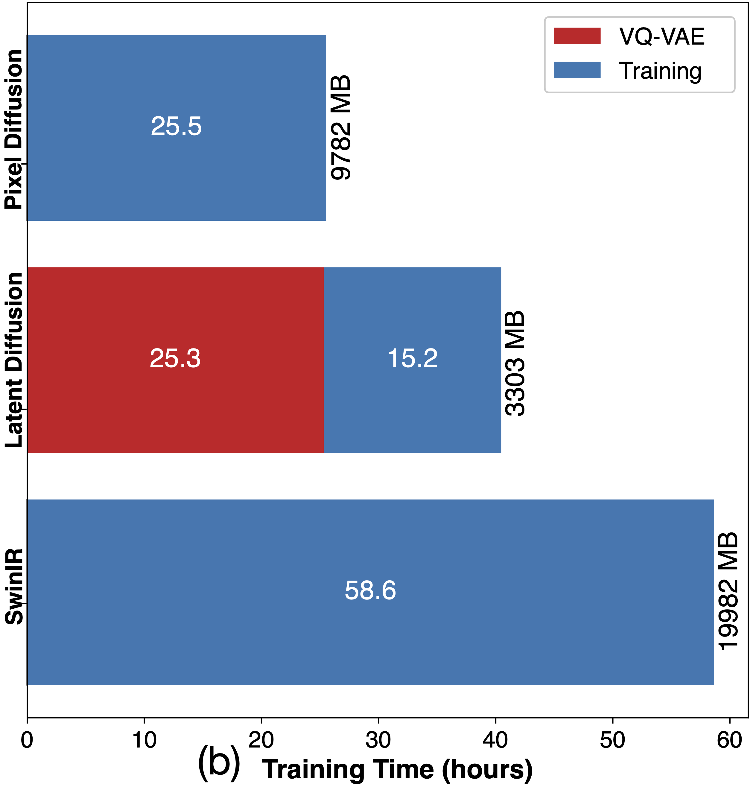 (a) Reconstruction time and GPU memory. The time is counted on medical dataset. (b) Training time and GPU memory of pixel diffusion, latent diffusion and SwinIR.